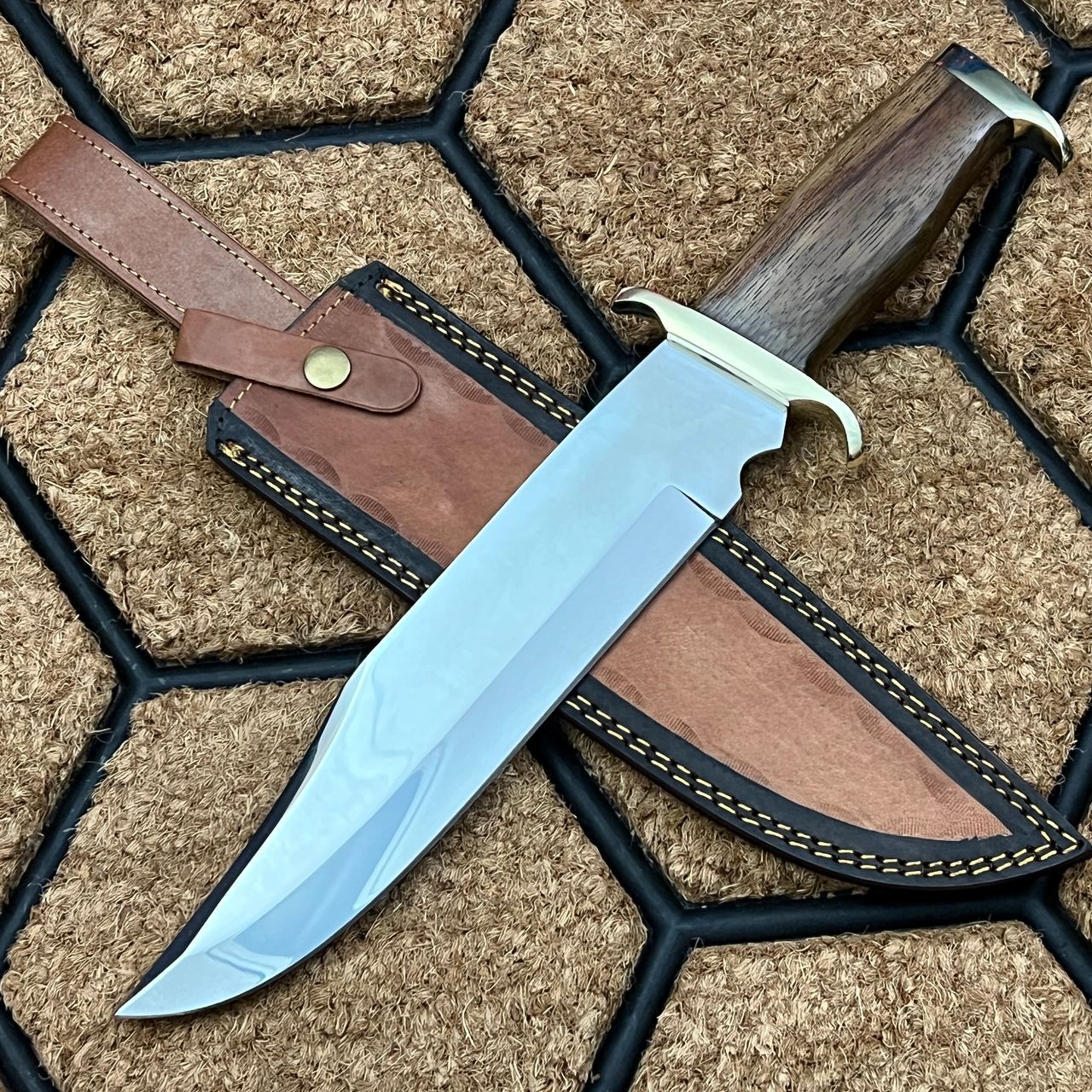Featuring a mirror finish, the blade measures approximately 10.5 inches in length, and the knife has an overall length of 16 inches. The walnut wood handle is adorned with a brass guard, providing a comfortable and secure grip for extended periods of use.
